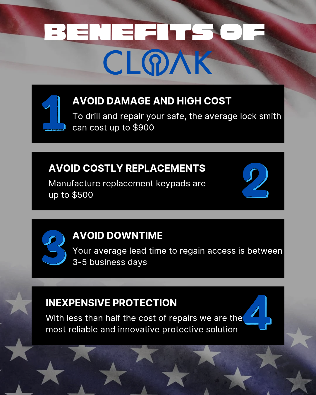 When protection matters, CLOAK preserves access and avoids the need for costly repairs or damaging your safe to retrieve your valuables in an emergency.